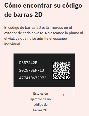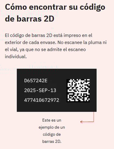 Haga clic en el botón que aparece abajo de este mensaje en la pagina que le redirigirá esta una herramienta de escanear .Comience escaneando el código de barras 2D del envase de su medicamento con su teléfono inteligente. A continuación, encontrará un ejemplo. Esto comprobará si el número de serie de su medicamento coincide con el de los medicamentos fabricados por Lilly y obtenidos en Estados Unidos.